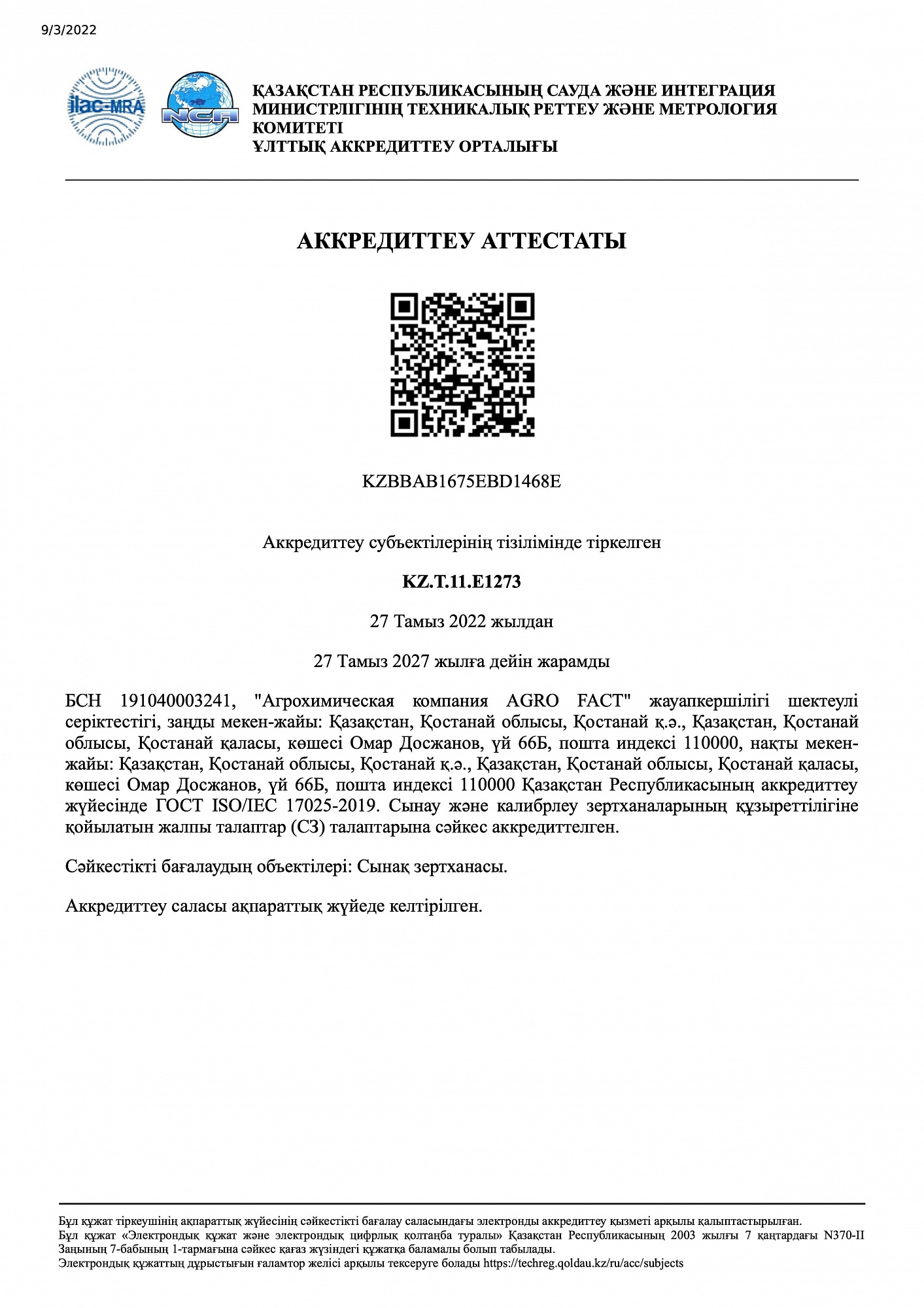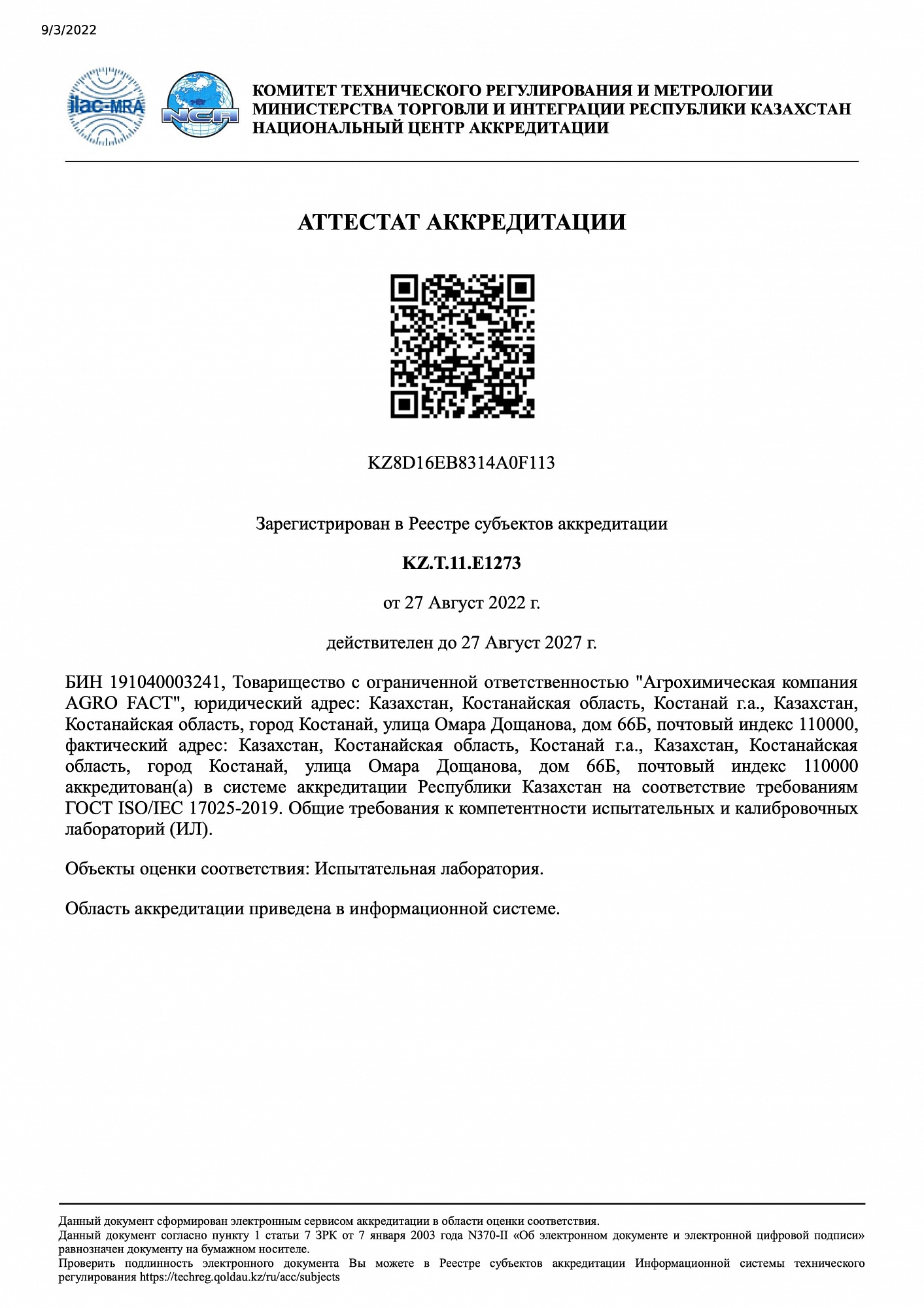 Мы проводим все исследования на базе нашей аккредитованной лаборатории в Костанае. Эксперты AGRO FACT обладают обширными знаниями и опытом в химическом анализе, что позволяет нам разрабатывать научно обоснованные рекомендации для повышения эффективности и плодородия ваших полей.
